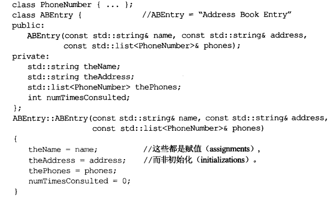 这会导致ABEntry对象带有你期望(你指定)的值,但不是最佳做法。C++ 规定,对象的成员变量的初始化动作发生在进入构造函数本体之前。在ABEntry构造函数内,theName,theAddress和thePhones都不是被初始化,而是被赋值。初始化的发生时间更早,发生于这些成员的 default构造函数被自动调用之时(比进入ABEntry构造函数本体的时间更早)。但这对 numTimesConsulted不为真,因为它属于内置类型,不保证一定在你所看到的那个赋值动作的时间点之前获得初值。