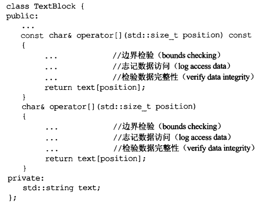 对于“bitwise-constness非我所欲”的问题,mutable是个解决办法,但它不能解决所有的const相关难题。举个例子,假设TextBlock(和CTextBlock)内的operator[]不单只是返回一个reference指向某字符,也执行边界检验(bounds checking)、志记访问信息(logged access info)、甚至可能进行数据完善性检验。把所有这些同时放进const和non-const operator[]中,导致这样的怪物。