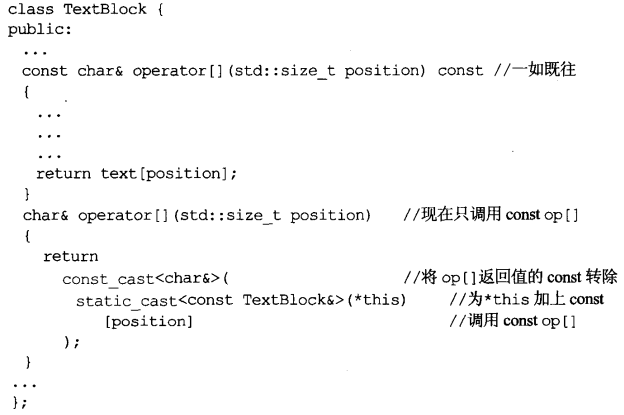 本例中const operator[]完全做掉了 non-const 版本该做的一切,唯一的不同是其返回类型多了一个 const 资格修饰。这种情况下如果将返回值的 const 转除是安全的,因为不论谁调用 non-const operator[]都一定首先有个 non-const 对象,否则就不能够调用non-const函数。所以令non-const operator[]调用其const一即使过程中需要一个转型动作。