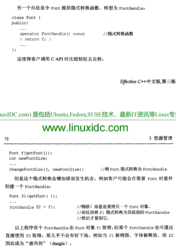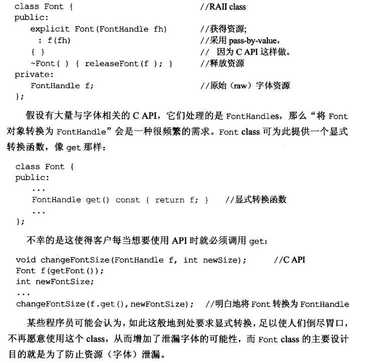 是否该提供一个显式转换函数(例如 get 成员函数)将RAII class转换为其底部资源,或是应该提供隐式转换,答案主要取决于RAII class被设计执行的特定工作,以及它被使用的情况。最佳设计很可能是坚持条款18的忠告:"让接口容易被正确使用,不易被误用"。通常显式转换函数如qet是比较受欢迎的路子,因为它将"非故意之类型转换"的可能性最小化了。然而有时候,隐式类型转换所带来的"自然用法"也会引发天秤倾斜。
