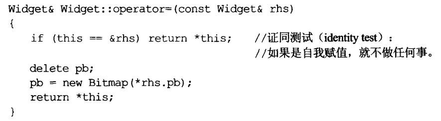 现在,如果 "newBitmap"抛出异常,pb(及其栖身的那个widget)保持原状。即使没有证同测试(identity test),这段代码还是能够处理自我赋值,因为我们对原bitmap 做了一份复件、删除原 bitmap、然后指向新制造的那个复件。它或许不是处理“自我赋值”的最高效办法,但它行得通。