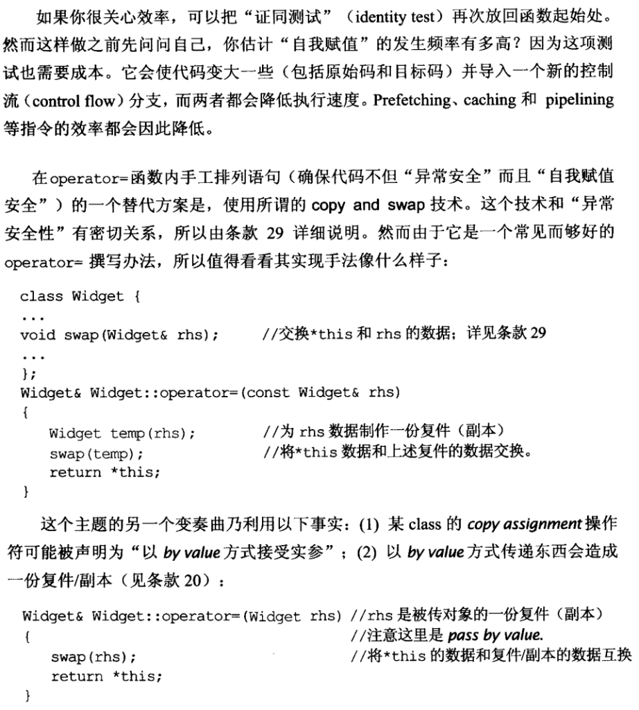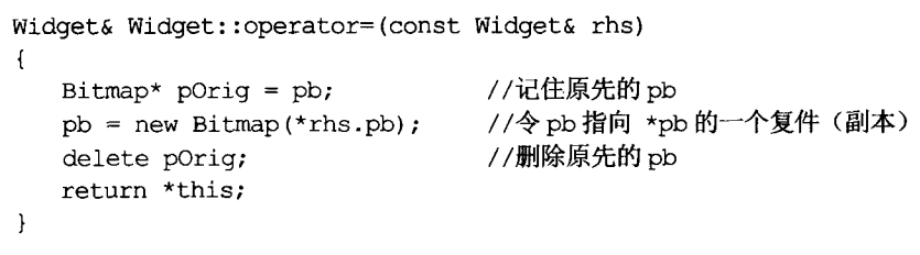 这样修改具有了“自我赋值安全性”,但还不具备“异常安全性”。如果"new Bitmap"导致异常(不论是因为分配时内存不足或因为Bitmap的copy构造函数抛出异常),widget最终会持有一个指针指向一块被删除的Bitmap。这样的指针有害。你无法安全地删除它们,甚至无法安全地读取它们。唯一能对它们做的安全事情是付出许多调试能量找出错误的起源。这样修改: