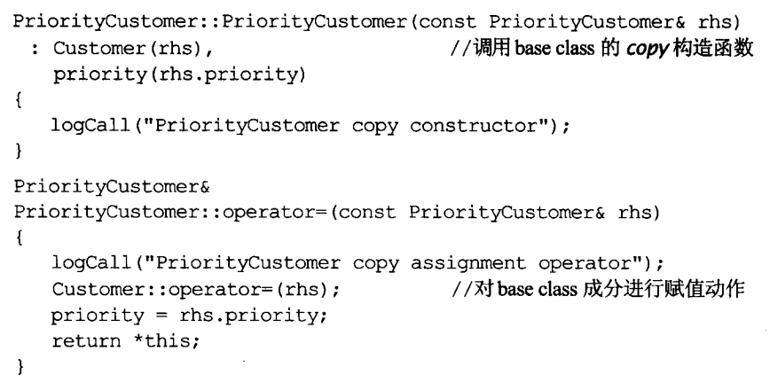 在继承时,派生类的copying函数也要注意不能只复制派生类中声明的成员变量而忘记基类中声明的成员变量。正确写法: