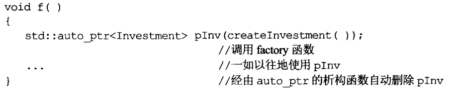 假设我们使用一个用来塑模投资行为(例如股票、债券等等)的程序库,其中各式各样的投资类型继承自一个 root class Investment。进一步假设,这个程序库系通过一个工厂函数createInvestment(factory function,见条款7)供应我们某特定的Investment对象。一如以上注释所言,createInvestment 的调用端使用了函数返回的对象后,有责任删除之。现在考虑有个f函数履行了这个责任,但是由于各种原因,比如过早的return,循环过早的退出,异常(尤其是后续维护,被修改,被别人修改)很可能导致f函数并未被成功执行。