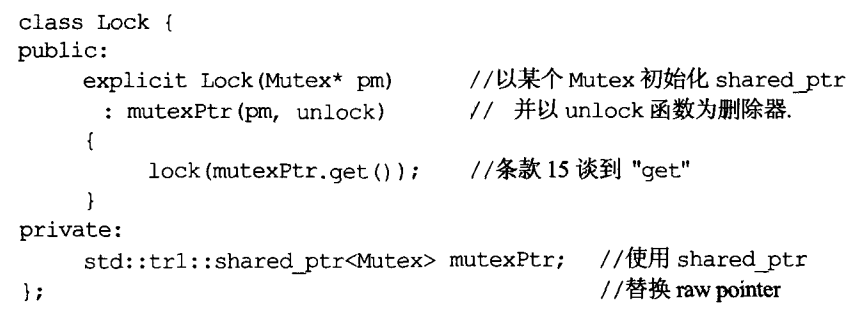 trl::shared_ptr和auto_ptr都提供一个get成员函数,用来执行显式转换,也就是它会返回智能指针内部的原始指针(的复件):int days = daysHeld(pInv.get());