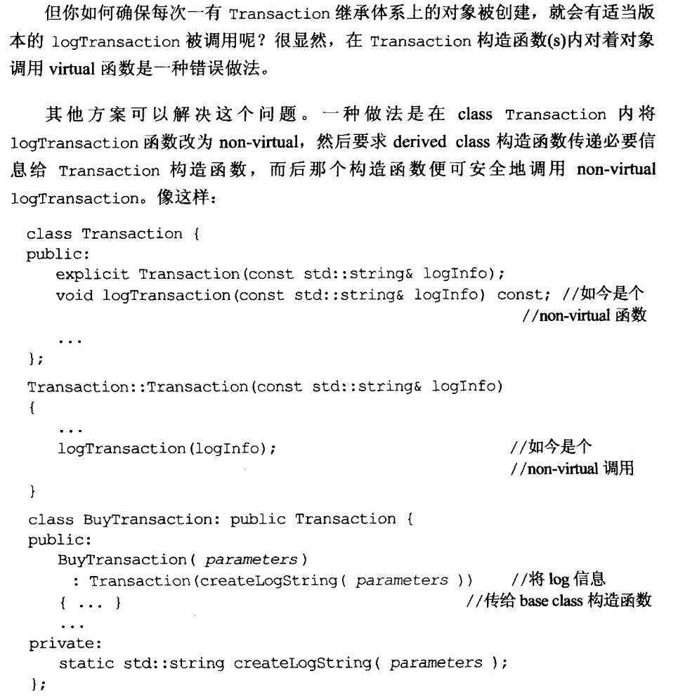 请注意本例之 BuyTransaction 内的 private static 函数 createLogString 的运用。是的,比起在成员初值列(member initialization list)内给予 base class 所需数据,利用辅助函数创建一个值传给 base class 构造函数往往比较方便(也比较可读)。令此函数为 static,也就不可能意外指向"初期未成熟之 BuyTransaction 对象内尚未初始化的成员变量"。这很重要,正是因为"那些成员变量处于未定义状态",所以"在base class构造和析构期间调用的virtual函数不可下降至derived classes"。